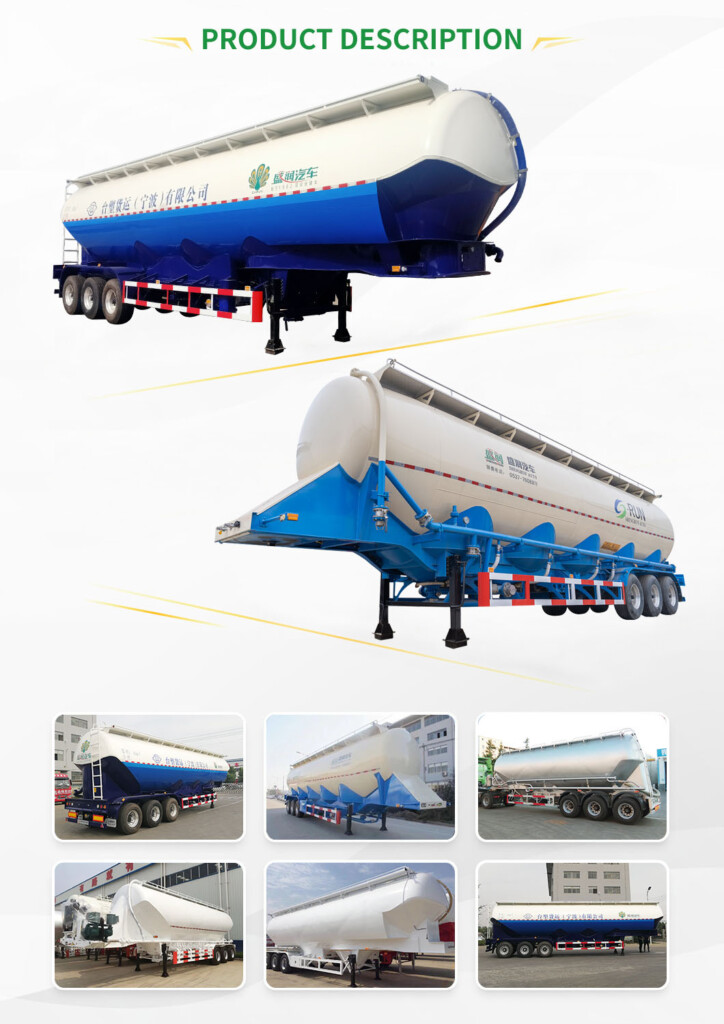 Shengrun Flour tank trailer is suitable for carrying flour and other light powder material,mainly transports edible powdered food wheat flour. Flour tanker semi trailer capacity 20 to 30 ton, volume 40 to 60 cbm. In order to keep the quality of food material, Shengrun wheat flour trailer adopts stainless steel material or Aluminium alloy material.