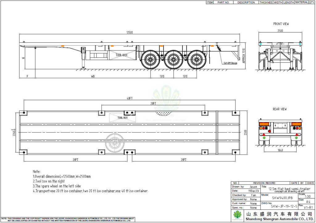 Shengrun flatbed container semi trailer dedicated to the transport of various containers, and also can be used to transport ordinary growth goods with its platform. It has sufficient strength, and mainly used in transport system, such as ships, ports, routes, highways, transit stations, bridges, tunnels, multimedia transport system.