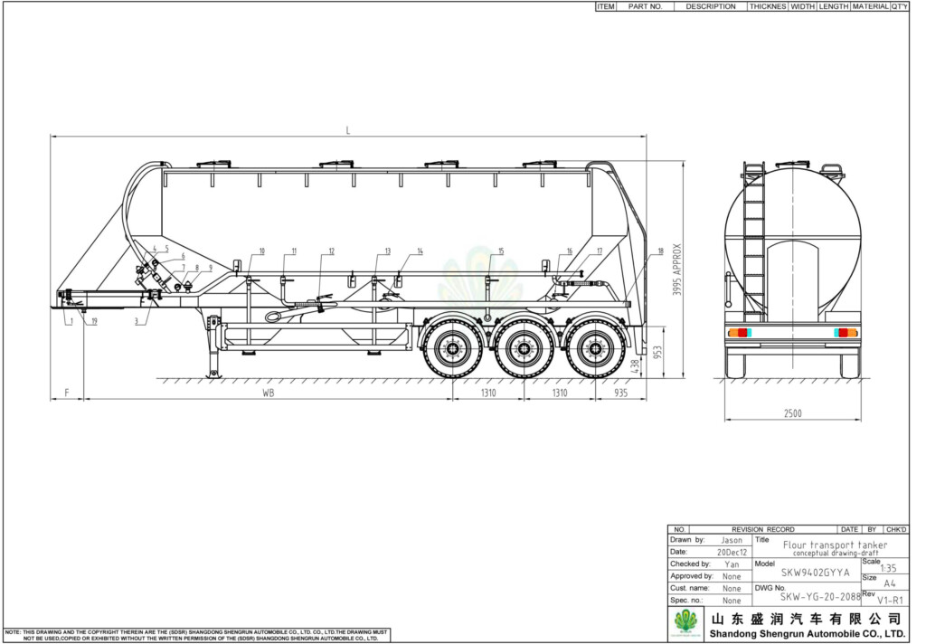 Shengrun Flour tank trailer is suitable for carrying flour and other light powder material,mainly transports edible powdered food wheat flour. Flour tanker semi trailer capacity 20 to 30 ton, volume 40 to 60 cbm. In order to keep the quality of food material, Shengrun wheat flour trailer adopts stainless steel material or Aluminium alloy material.